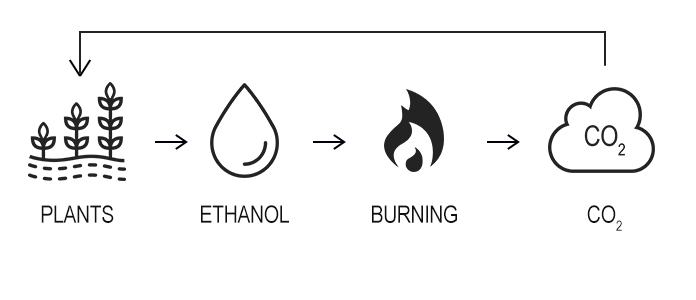 Produktet anësore të djegies së bioetanolit janë avulli i ujit dhe një sasi shumë e vogël CO₂. Ky CO₂ absorbohet nga bimët, duke krijuar një proces djegieje Net Zero, shumë më miqësor me mjedisin sesa karburantet fosile.