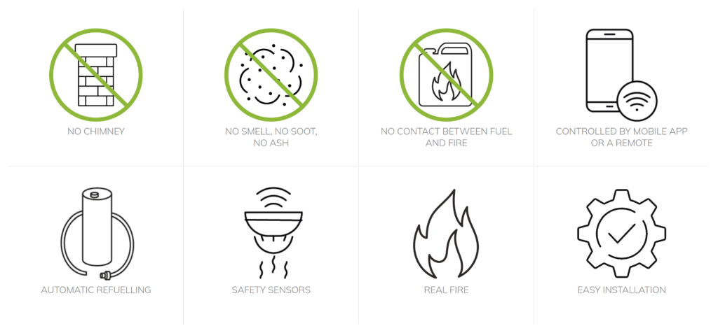I gjithë procesi i djegies është i automatizuar dhe menaxhohet nga një mikroprocesor. Karburanti i ftohtë ruhet në një rezervuar hermetikisht të mbyllur. Kur pajisja ndizet, një sasi e vogël dhe e nevojshme bioetanoli transferohet drejt gjeneratorit të avujve, ku nxehet derisa të shndërrohet në avull. Ky avull shpërndahet në djegës dhe ndizet.